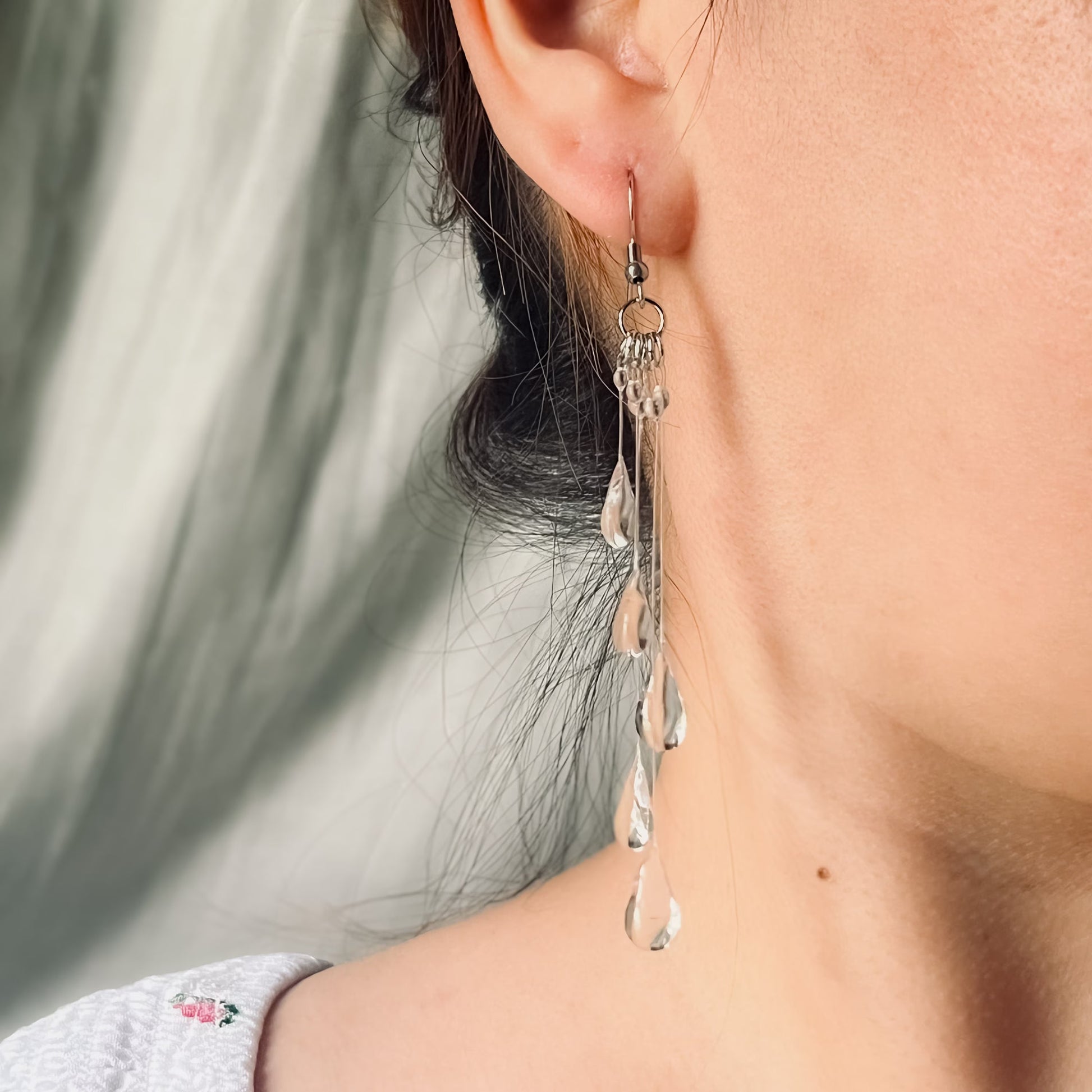 Handmade falling rain inspired UV resin earrings, made with UV resin and filament line. See below for more specifications. Metal closures available in 304 grade surgical stainless steel.