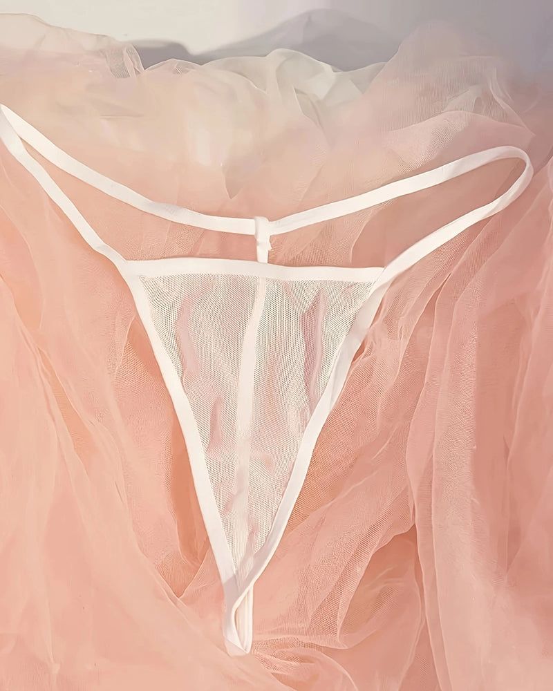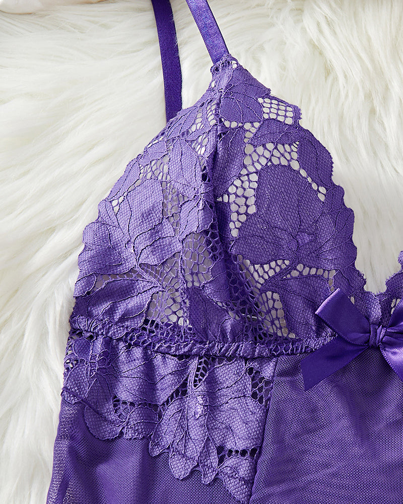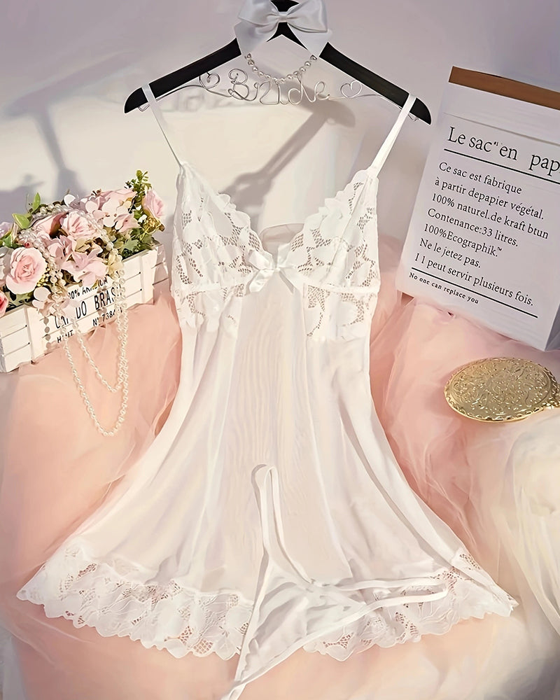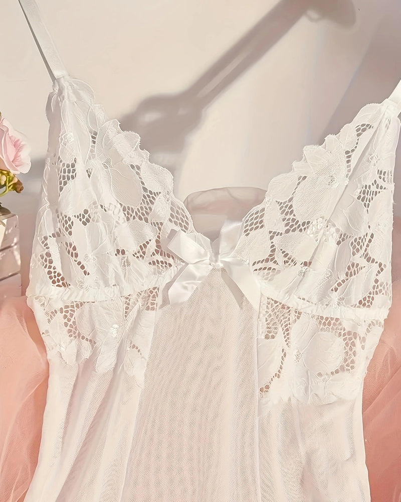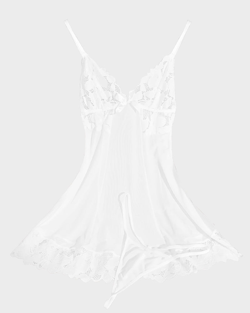 V-Neck Sheer Lace Mesh Nightgown with G-String